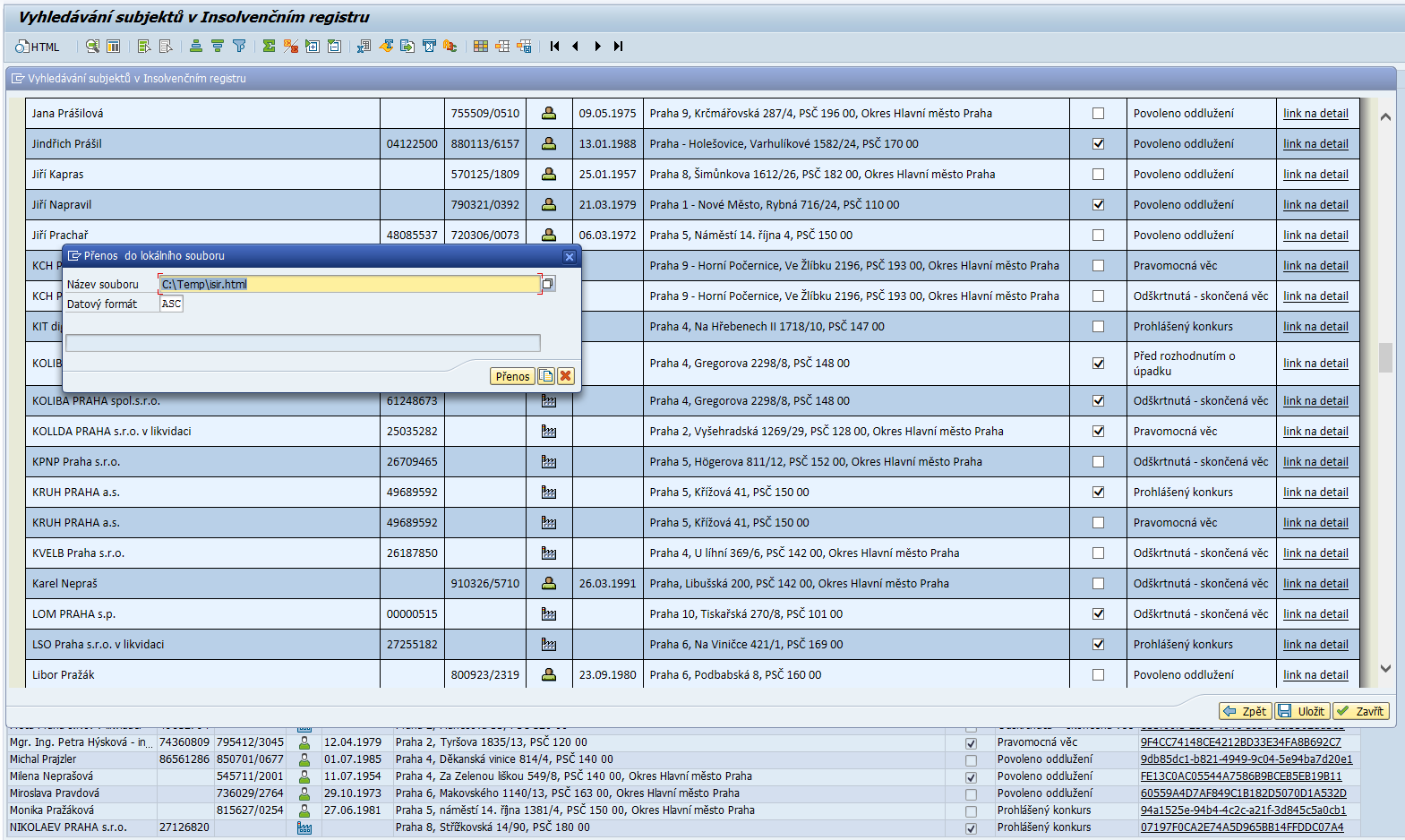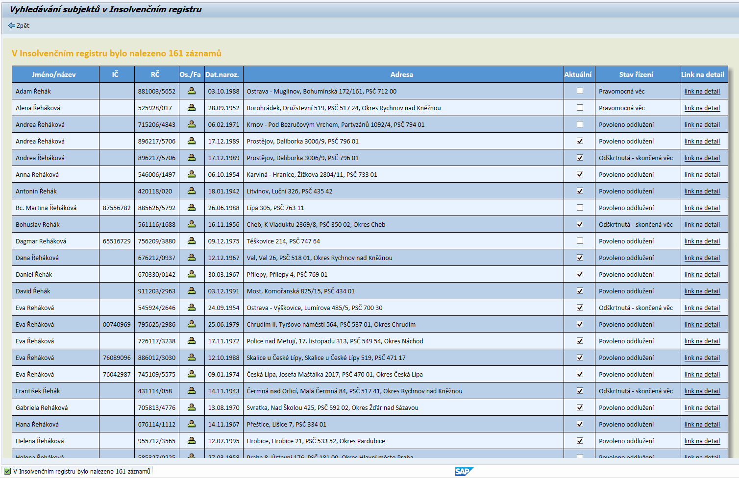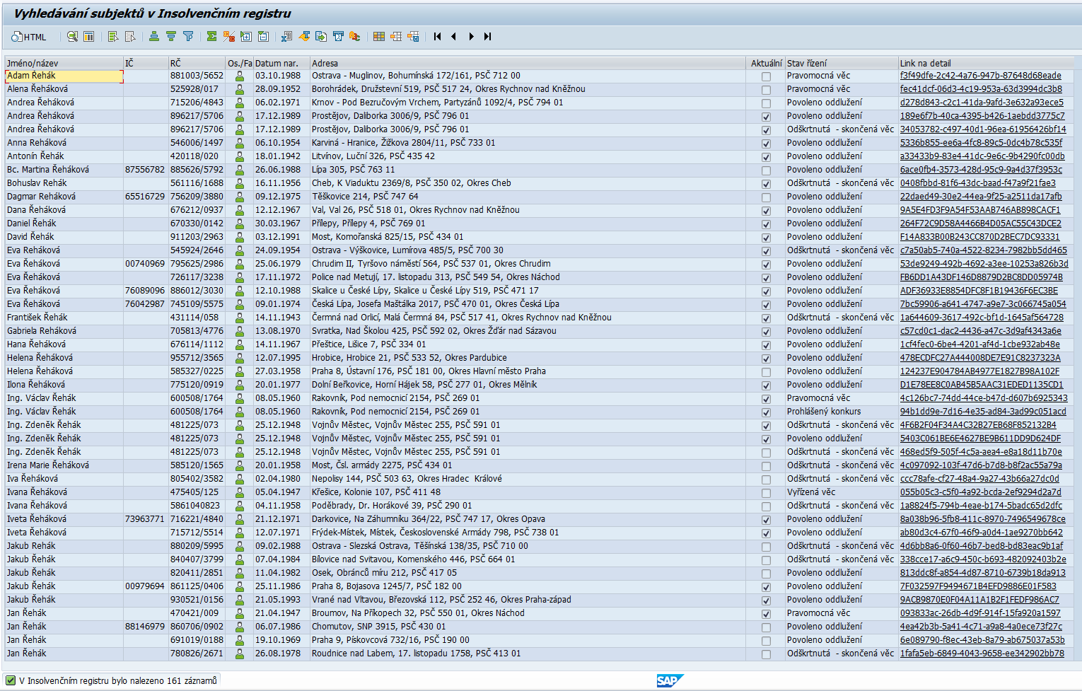 Propojení SAPu s insolvenčním registrem je řešeno formou zákaznické transakce ZISIR, která přistupuje k aktuálním on-line datům portálu Justice.cz na adrese isir.justice.cz. Můžete si tak snadno prověřit, zda Vaši zákázníci nejsou v insolvenci přímo z ERP systému.