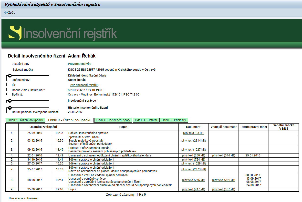 Záznamy v registru je možné vyhledávat pomocí různých kritérií: