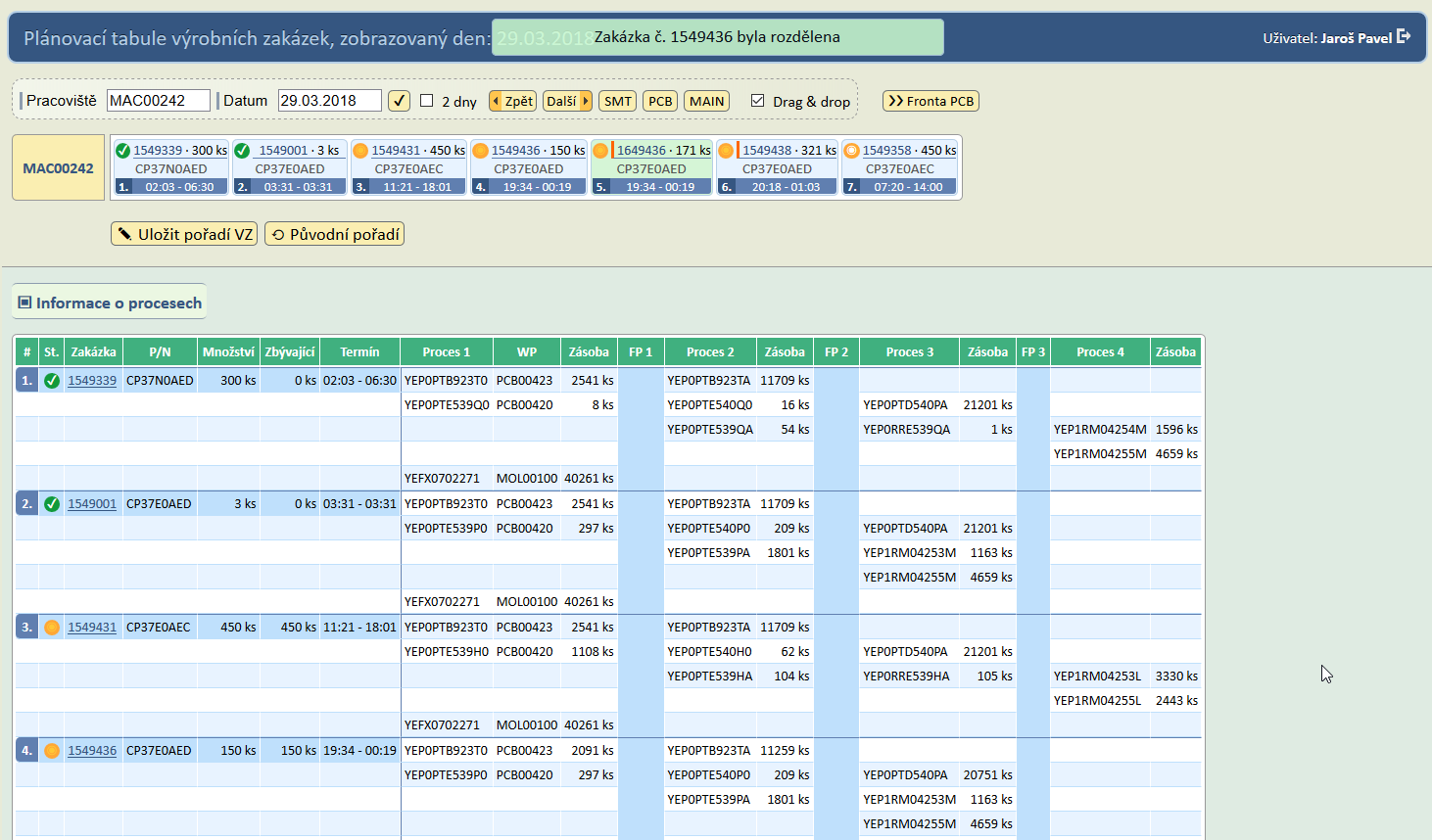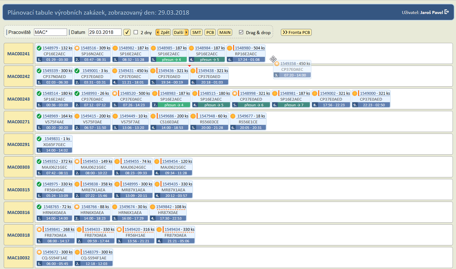 Z výše uvedených řešení vybírám na ukázku nástroj k provádění rychlých změn v rozvržení výrobního plánu. Aplikace je navržena tak, aby s ní mohl pohodlně pracovat vedoucí linky (line leader) na tabletu. Díky ovládní drag & drop lze snadno přeskupit výrobní zakázky na lince, popřípadě zakázky dělit. Pro lepší představu příkládám následující obrazovky.