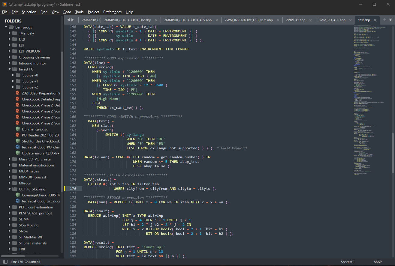 Nevyhovuje Vám standardní ABAP editor? Původně jen pro své vlastní potřeby jsem vytvořil tento jednoduchý plugin do textového editoru Sublime Text, který jednak umí zvýrazňovat ABAP syntaxi, rozeznávat funkční bloky kódu a navigovat mezi nimi (viz screenshot) a také Vám samozřejmě dokáže napovídat při psaní kódu. Vedle toho editor geniálním způsobem pracuje se snippety (výstřižky kódu), které můžete snadno definovat své vlastní a díky nim budete vytvářet své zdrojáky maximálně efektivně.